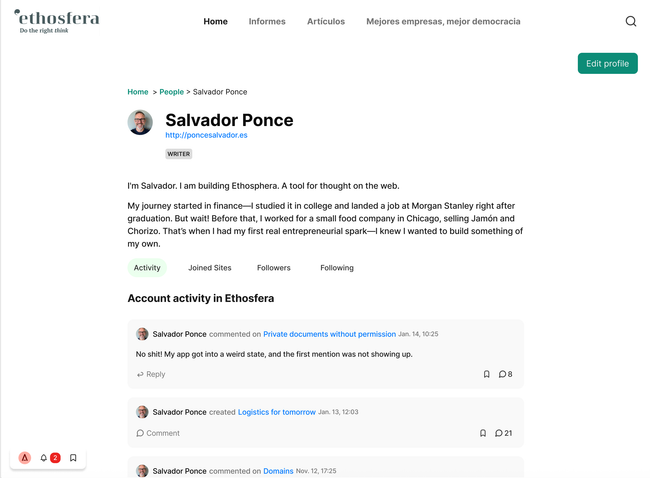 2.2. User sees member's detail with different areas: Bio, Activity, Subscribed sites..., Link to website (if there is)